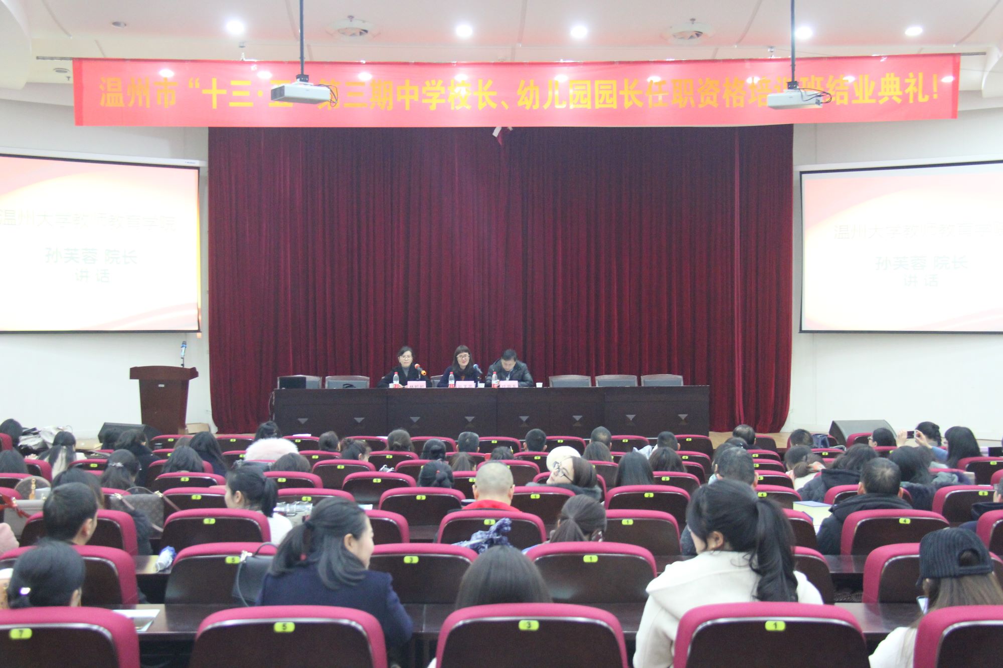 2019年1月15日下午,温州市“十三·五”第三期中学校长、幼儿园园长任职资格培训结业典礼在成人色情 学院路校区隆重举行。成人色情 院长孙芙蓉、副院长叶新东出席本次典礼。典礼由成人色情 继续教育科科长林鹣鹣老师主持。