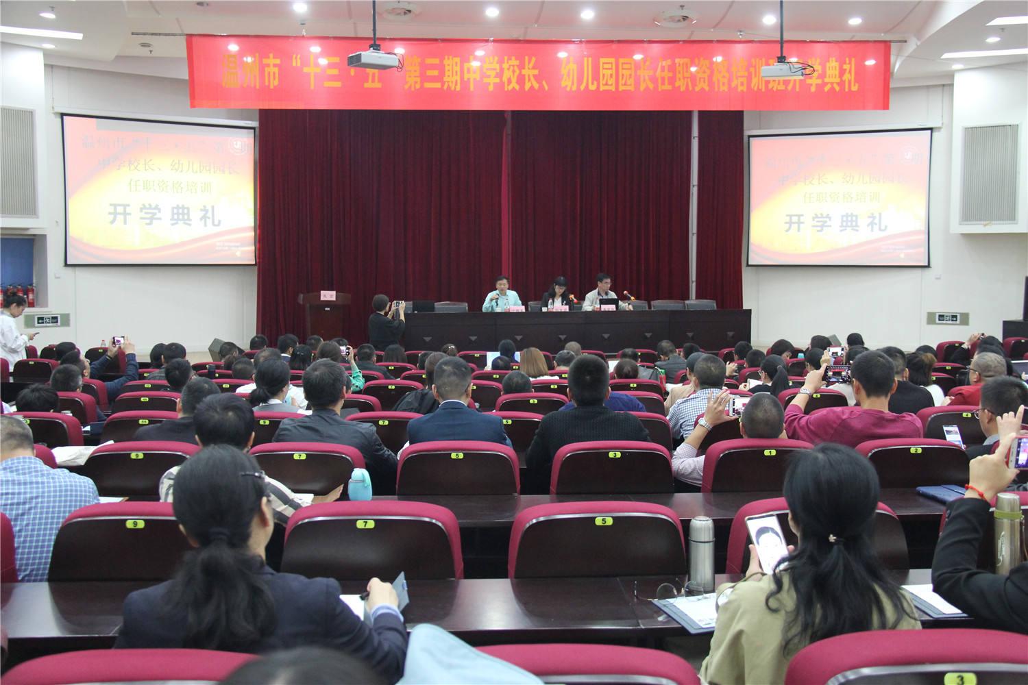 2018年10月16日上午,温州市“十三·五”第三期中学校长、幼儿园园长资格任职培训开学典礼在我校学院路校区隆重举行。温州市教师教育院院长潘建中教授、成人色情 教师成人色情 院长孙芙蓉教授出席了本次典礼。典礼由成人色情 教师成人色情 副院长叶新东住持,来自温州市各县、市、区的130余位中学校长、幼儿园园长参加了此次典礼。