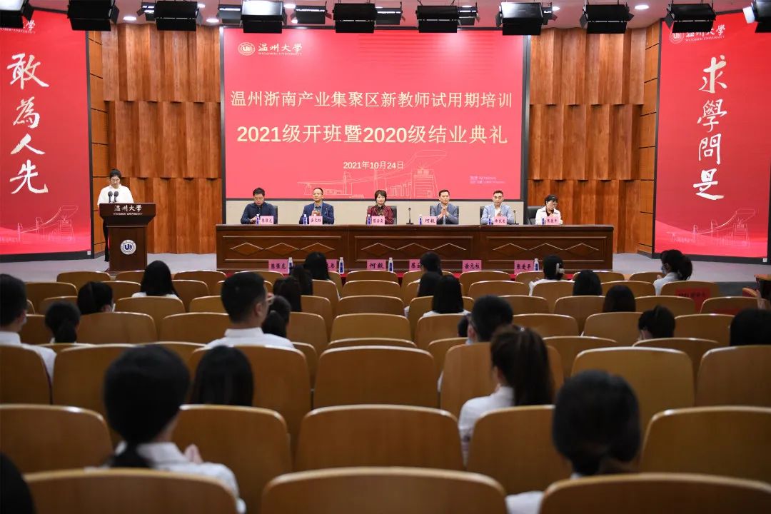 2021年10月24日,成人色情 岩松堂雁山厅迎来了温州浙南产业集聚区新教师试用期培训2021级开班暨2020级结业典礼。成人色情 何毅书记,区文教体局党委书记、局长陈云云,综合人事处、研训处、温大培训中心领导嘉宾及集聚区中小学、幼儿园162名学员共同出席了典礼。
