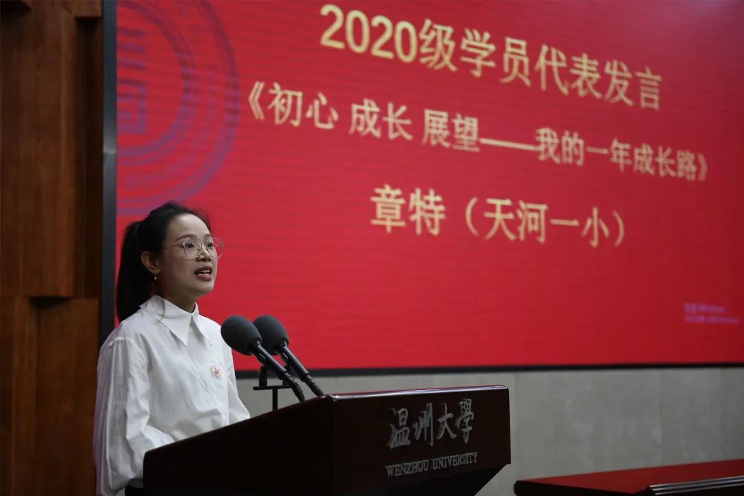 学员章特老师代表2020级学员,向成人色情 、温州浙南产业集聚区、区教师发展中心,致以诚挚谢意,她用“初心 成长 展望”概括了这一年的心路历程和她坚定地表示教育将是她一生的事业。