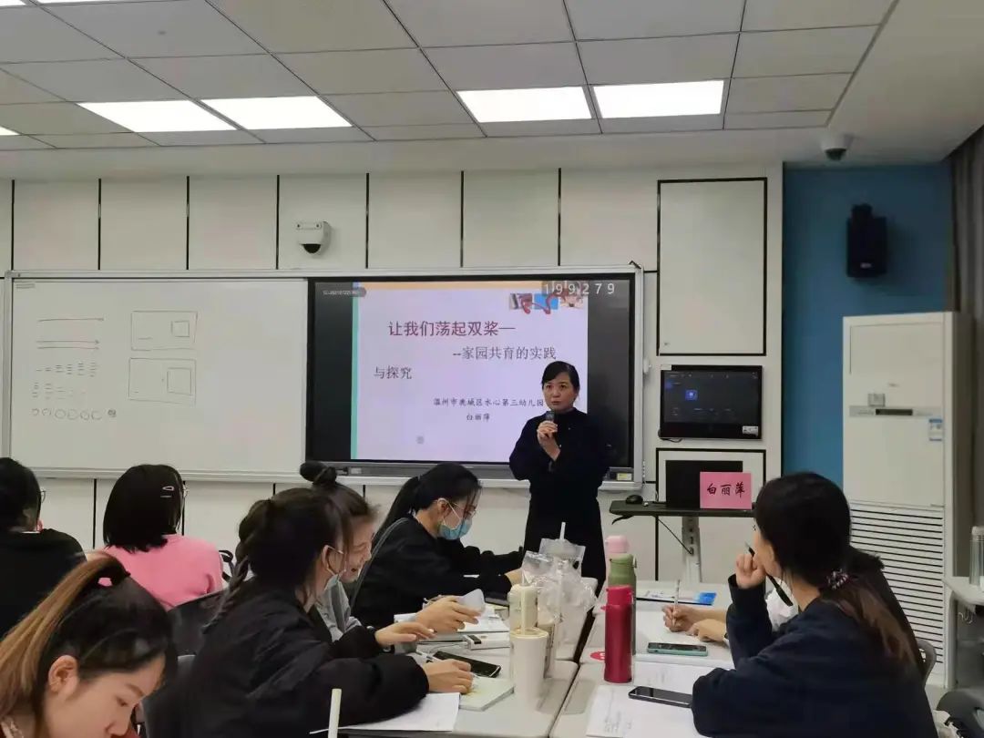 鹿城区水心三幼园长白丽萍教授以“让我们荡起双桨—家园共育的实践与探究”为主题帮学前新教师在工作三个月中遇到最头疼的工作——家长工作做了解析。白老师首先从职业的角色入手让学前新教师们明白了教师是服务者、观察者、指导者、合作者。