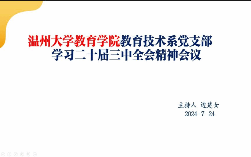 【成人色情 教育技术系党支部】2024年7月24日,在前期自主学习会议精神的基础上,成人色情 教育技术系党支部全体党员在线上,由支部书记边楚女带领,进一步深入学习党的二十届三中全会精神。边老师率先分享了自己对于“为何学、重点学什么、如何将学与做相结合”的体会,让大家深刻感受到党中央全面深化改革的坚定决心与战略部署。随后,党员们踊跃发言。张新立老师表示,对“求真务实敢作为,锐意进取绘新章”理念有了更深刻的认识;叶新东老师围绕强化科技创新、促进产业进步和提升民生幸福等目标畅谈体会;杨刚老师则认为,党的二十届三中全会精神为大家提供了宝贵的思想武器与行动指南,学习过程中,深切体会到“锐意进取”这一时代精神的内涵。会议期间,每位党员都结合会议精神,就如何融入今后实际工作展开讨论交流,提出了许多中肯建议。