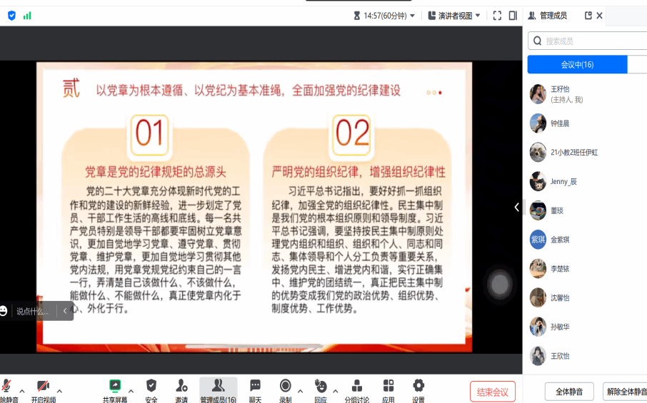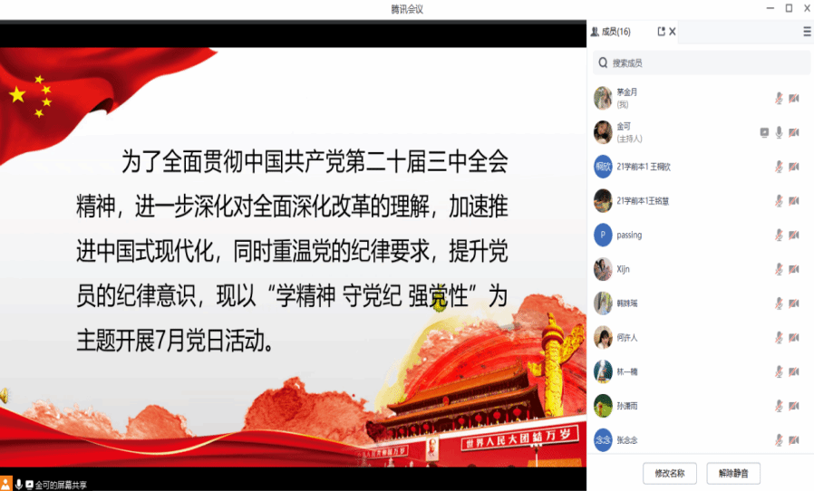 2024年7月26日,成人色情 第六学生党支部通过线上腾讯会议举办七月第二次党日活动,由方珊主持,董雅宁、潘锦豪协同,全体党员参会。活动包含三项内容:董雅宁带领学习二十届三中全会精神,介绍全会主要内容,总结《中共中央关于进一步全面深化改革、推进中国式现代化的决定》的六个关键点;潘锦豪引领重温《中国共产党纪律处分条例》,阐述新版条例11章158 条的八大亮点;最后播放警示教育视频《代价》,以官员贪污受贿的惨痛教训警示党员。此次活动使党员们深刻领悟会议精神,强化纪律意识。
