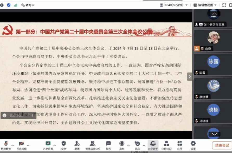 2024年7月29日,成人色情 教育学系党支部组织学习党的二十届三中全会公报及相关决定,由支部书记周奇主持,全体党员出席。会议指出,此次全会意义重大,成绩得益于党中央领航与思想指引,要深刻领悟“两个确立”,做到“两个维护”。全会通过的《决定》是指导新时代新征程进一步全面深化改革开放的纲领性文件,彰显党中央改革决心。会议强调,学习贯彻全会精神是首要任务,教育系党支部要领会精神、推动进教材课堂头脑、加大宣传阐释、组织对策研究,将全会精神转化为实际行动,为深化改革和推进中国式现代化贡献力量。