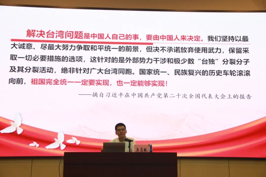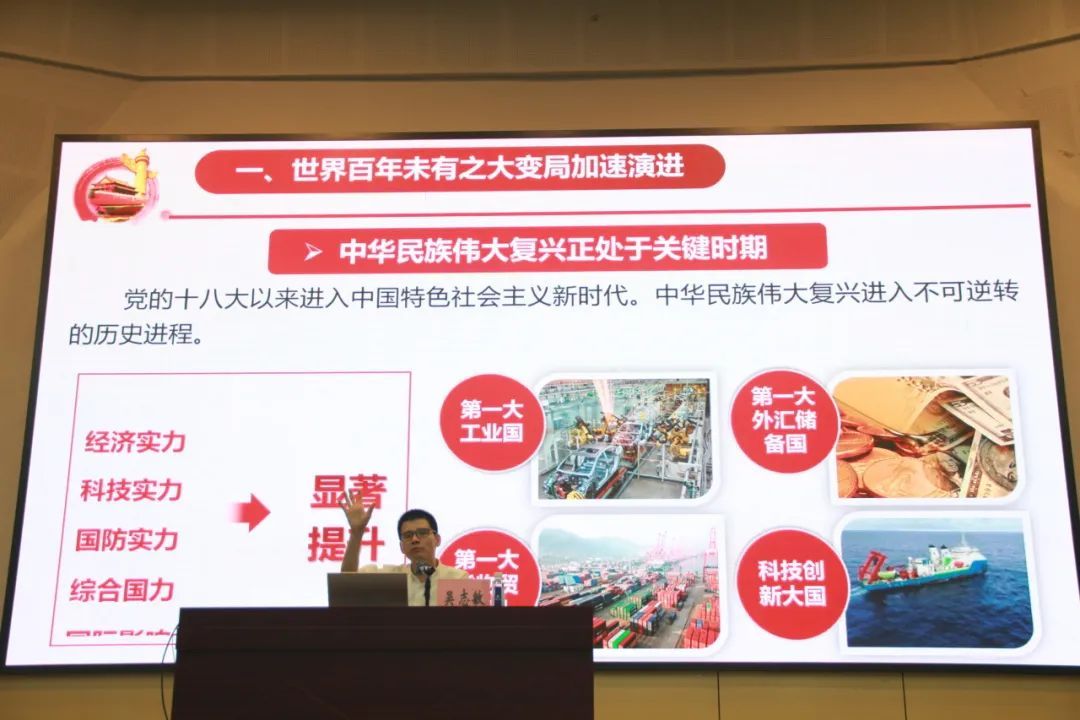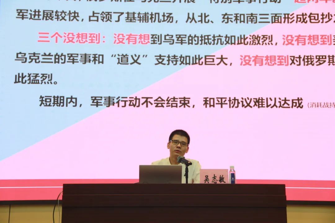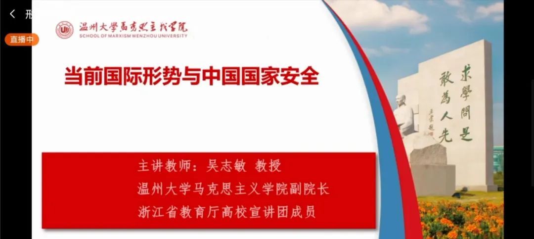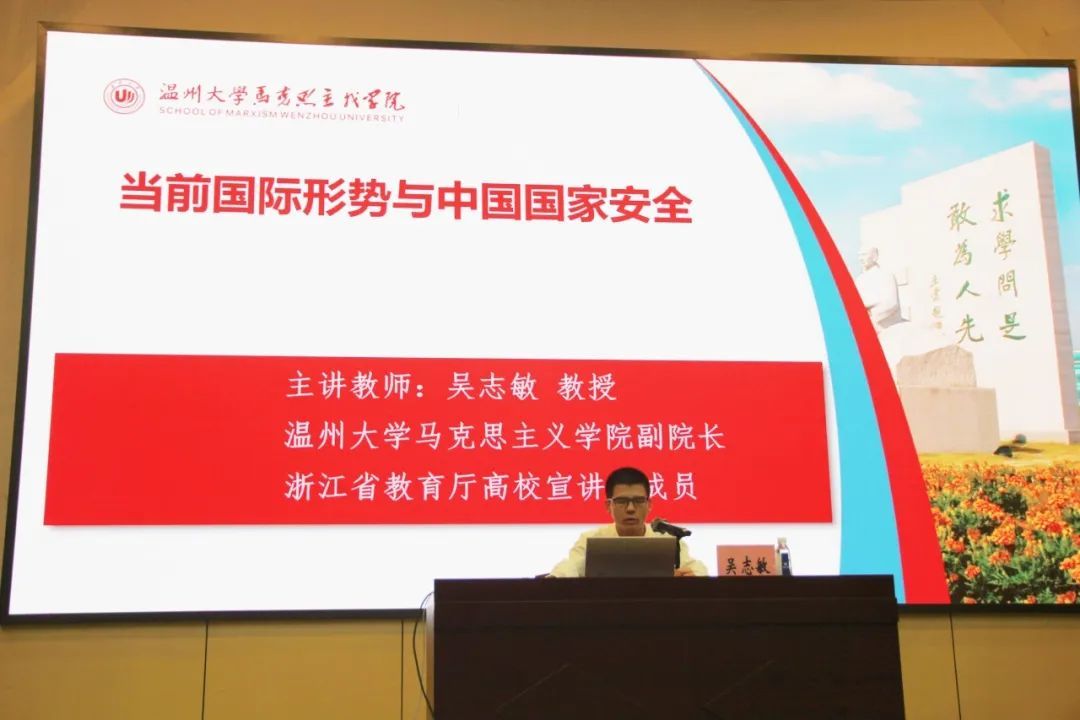 6月12日下午,成人色情 开展以“当前国际形势与中国国家安全”为主题的《形势与政策》课,成人色情 马克思主义学院副院长、浙江省教育厅高校宣讲团成员吴志敏教授担任本次课程主讲人,学工办辅导员孟江龙主持本场讲座。