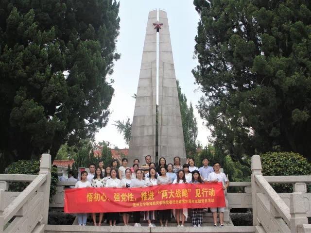 2018年6月29日下午,教师成人色情 组织师生党员赶赴江心屿,开展“悟初心、强党性,推进‘两大战略’见行动”的主题党日活动。在江心屿革命烈士纪念碑前,教工党员潘士杰与学生党员张乐代表学院为革命烈士献上花圈,在场党员同志默哀并鞠躬,表达对革命先烈的缅怀之情。在鲜红的党旗下,聂海燕同志带领各位党员同志重温入党誓词。学生党员阮郑醒、周文带领大家一起学习了毛泽东同志的《为人民服务》与习近平同志的《用党员的标准严格要求自己》两篇文章。学院党委书记杨立淮在革命烈士纪念碑前发表了讲话,他结合这两篇文章的学习指出,学院党组织和党员要始终牢记全心全意为人民服务的宗旨,在推进事业发展中要发挥好基层党组织战斗堡垒作用和党员先锋模范作用。最后,党员同志们在解说员的带领下参观革命纪念馆。党员同志们纷纷表示,应该继承先烈遗志,发扬革命传统,坚定理想信念,不忘初心,为党的事业奋斗。