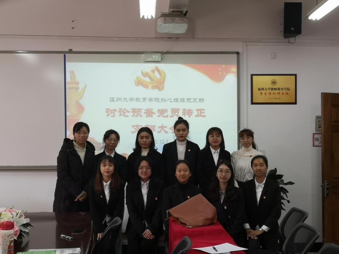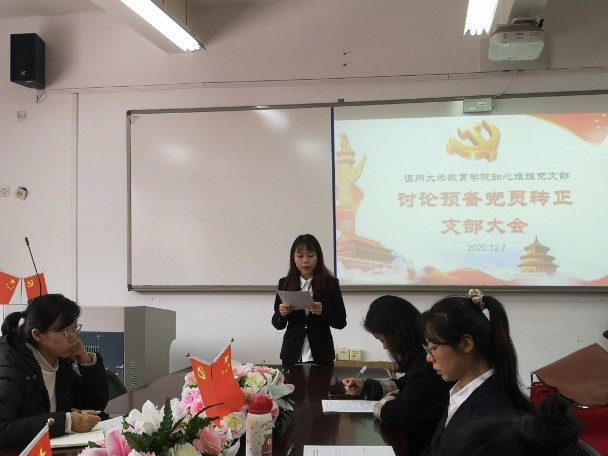 2020年12月7日,知心姐姐党支部中共预备党员转正大会在成人色情 9A204举行,会议由徐嘉浠同志主持,该支部全体党员参与此次会议。经党支部大会决议,一致同意周胜男同志按期转为中共正式党员。