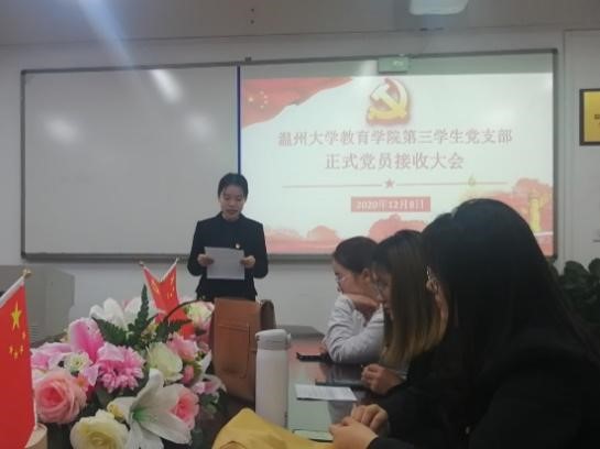 2020年12月8日,第三学生党支部中共预备党员转正大会在成人色情 9A204举行,会议由党支部书记何奔奔同志主持,该支部全体党员参与此次会议。经党支部大会决议,一致同意杨佳检、洪蒋禧、林纯、陈渝渝和周金瑜五位同志按期转为中共正式党员。