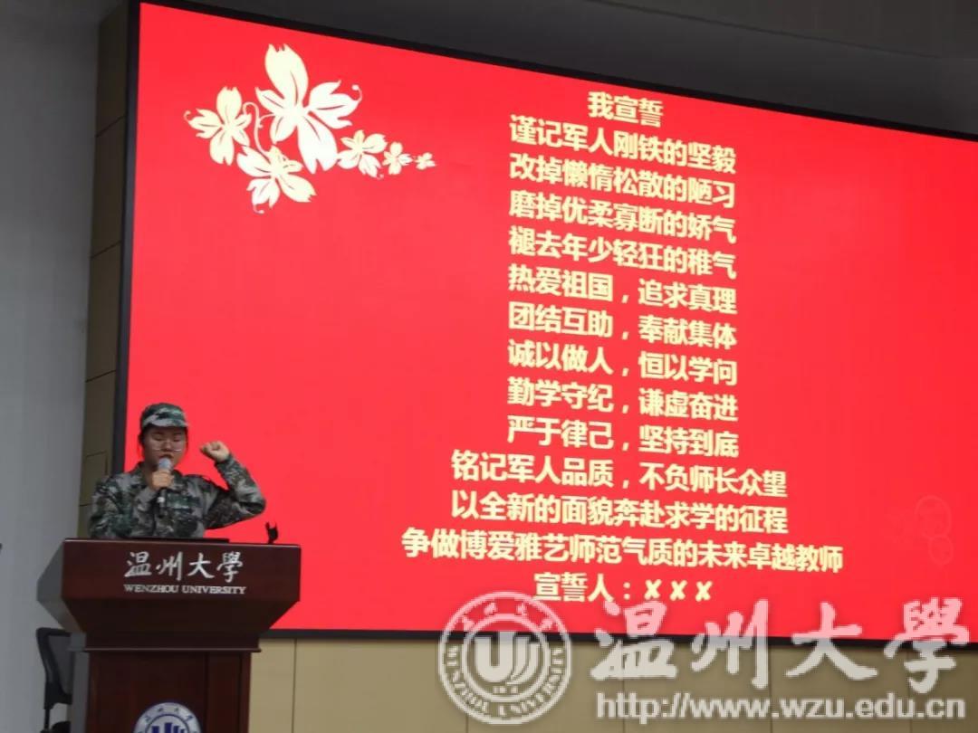 活动伊始,教室肃静,群情激昂。宣誓仪式在庄重严肃的宣誓词中拉开帷幕,学子们举起右拳,宣誓时铿锵坚定。“铭记军人品质,不负师长众望。以全新的面貌奔赴求学的历程,争做博爱雅艺师范气质的未来卓越教师!”鲜艳的红色背景下,掷地有声的宣誓令全体师生热血沸腾、心潮澎湃,激励着学子们学习军人坚毅奉献的精神,争做新时代的弄潮儿。