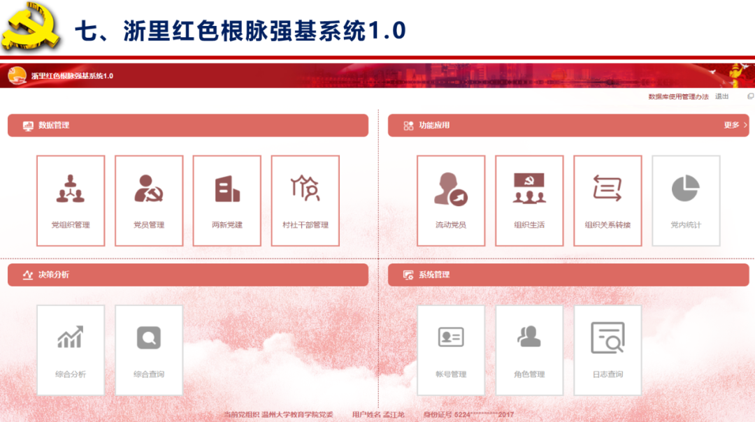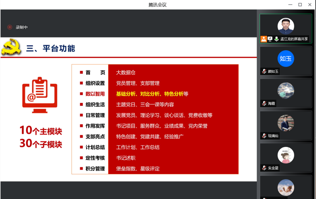 孟江龙结合成人色情 党支部数字化管理平台的开发背景,围绕平台管理、平台功能和平台操作演示等内容再次进行简短的培训,并对《成人色情 党支部“堡垒指数”星级考评实施办法(试行)》、浙里红色根脉强基系统的使用进行了详细的说明。该平台以“堡垒指数”为核心,设置“大数据仓”“组织设置”“数以智用”“组织生活”“日常管理”等10大主模块、30大子模块的具体应用场景,平台端口嵌入“我的温大”APP,可全面接入学校数据中枢,实现数据互联互通互享。参会人员也围绕平台的前期使用情况和实际操作中总结的经验开展了简短的交流研讨。