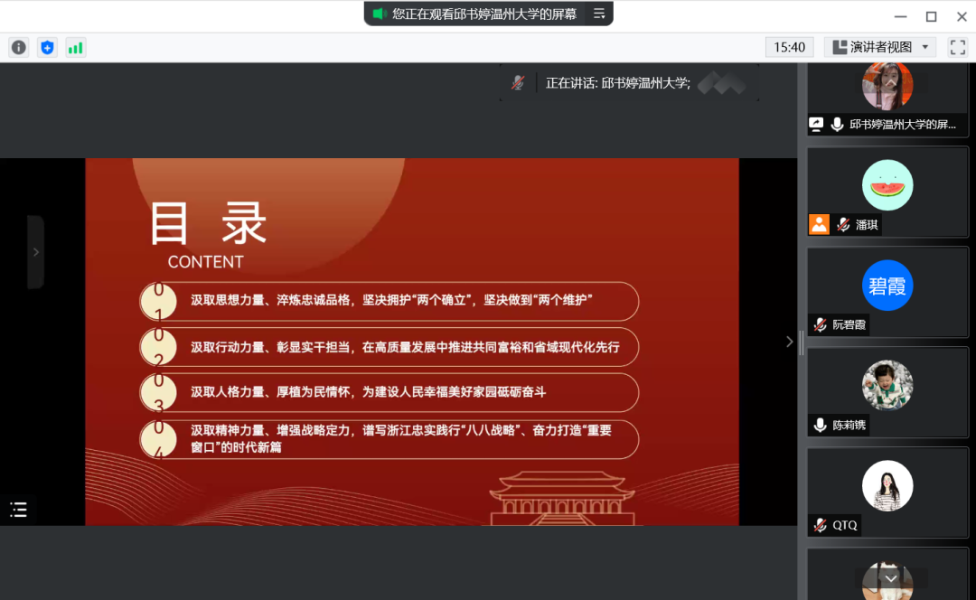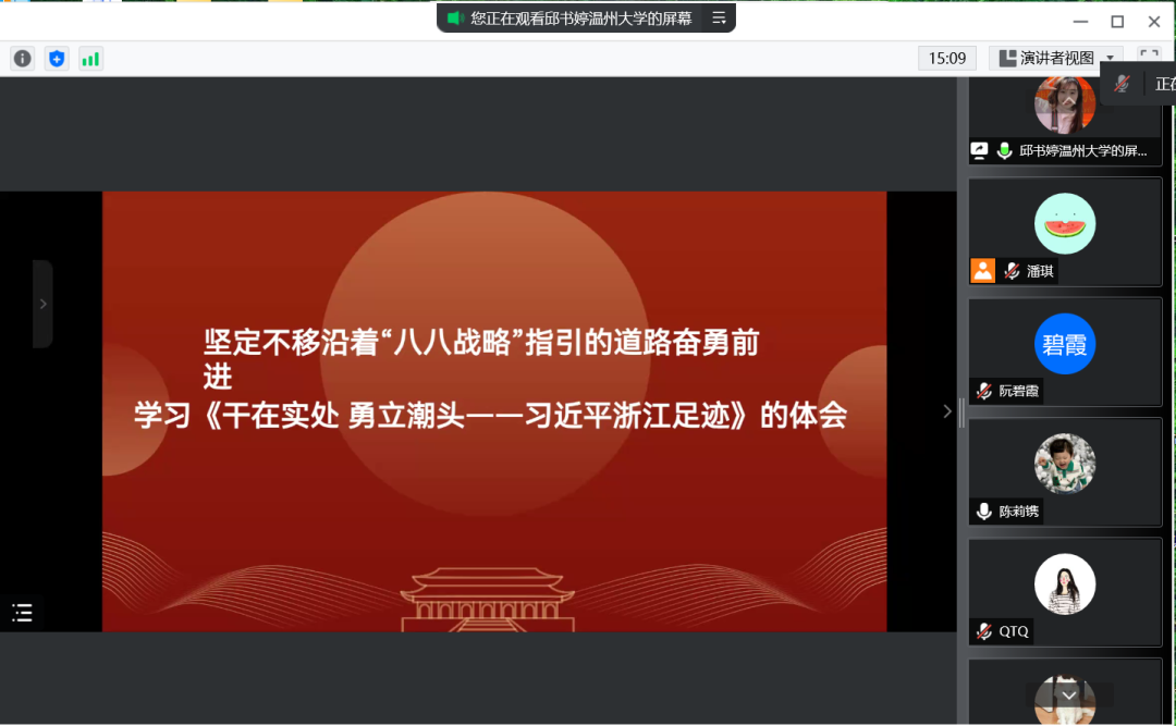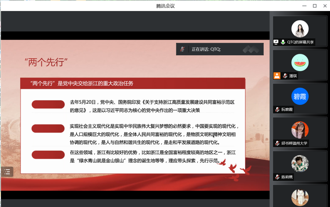 首先,邱书婷同志分享了《坚定不移沿着“八八战略”指引的道路奋勇前进》,她从“汲取思想力量、淬炼忠诚品格,坚决拥护‘两个确立’,坚决做到‘两个维护’”“汲取行动力量、彰显实干担当,在高质量发展中推进共同富裕和省域现代化先行”“汲取人格力量、厚植为民情怀,为建设人民幸福美好家园砥砺奋斗”“汲取精神力量、增强战略定力,谱写浙江忠实践行‘八八战略’、奋力打造‘重要窗口’的时代新篇”四个方面进行了介绍,倡导大家积极学习“八八战略”;随后,乔添琪同志从“两个维护”、“当好开路先锋”两方面号召党员要坚定不移地做“两个确立”忠诚拥护者、“两个维护”示范引领者,努力当好“两个先行”开路先锋。最后支部全体成员从自身出发,结合理论学习主题进行了交流讨论。
