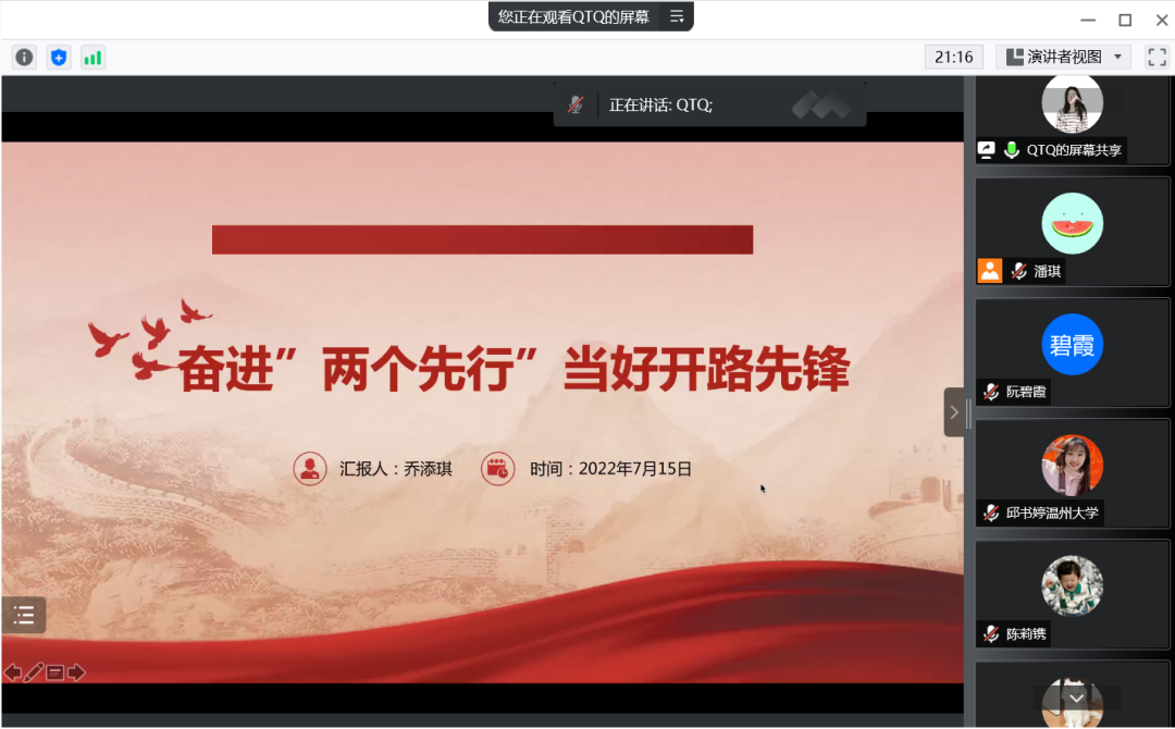 2022年7月12日,成人色情 第九学生党支部于钉钉会议线上举行了“奋进‘两个先行’ 当好开路先锋”和“红七月·服务月”活动暨“当先锋、争先行”主题党日活动。第九学生党支部全体党员参加了活动,本次活动由王旦主持。
