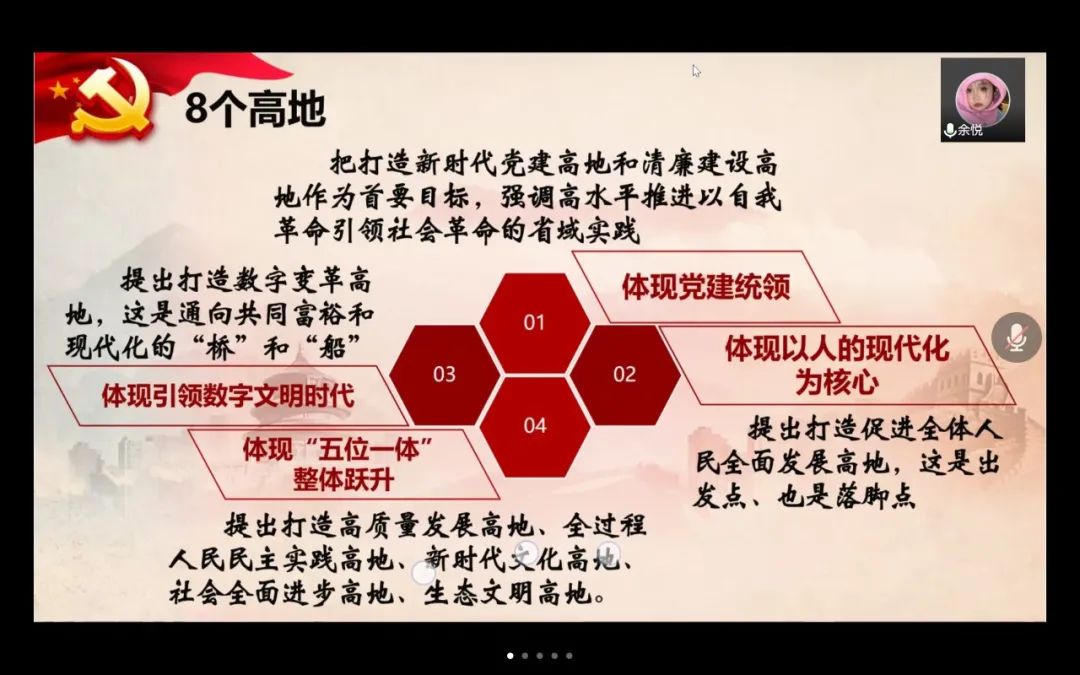 本次理论学习的内容为省十五次党代会以及《习近平浙江足迹》,共有四位同志领学。卢华同志领学的主题是“干在实处,勇立潮头”;王佳姚同志领学的主题是“坚定不移沿着‘八八战略’指引的道路奋勇前进”;张炜菊同志领学的主题是“迈向新征程,开创新未来”;苏妍同志领学的主题是“忠实践行‘八八战略’,坚决做到‘两个维护’”。