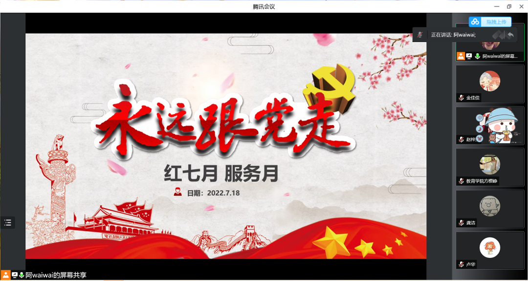2022年7月20日,知心姐姐党支部于腾讯会议上开展“奋进‘两个先行’当好开路先锋”主题“红七月·服务月”暨“当先锋、争先行”主题党日活动学习的成果交流汇报。