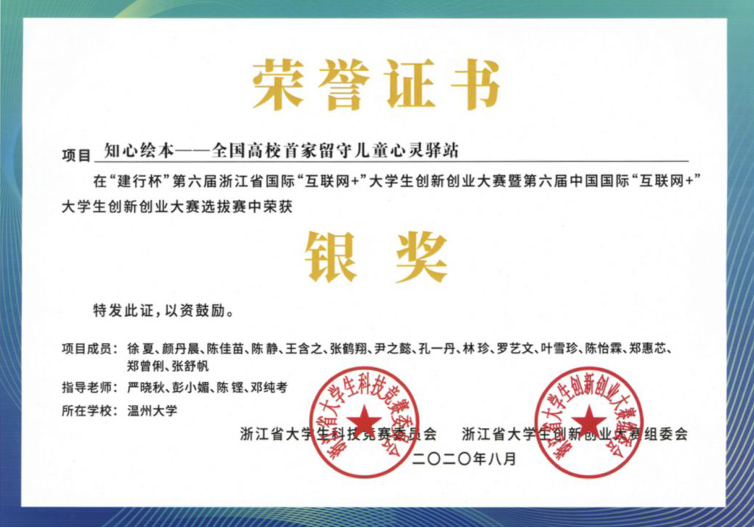 第六届浙江省国际“互联网+”大学生创新创业大赛——荣誉证书